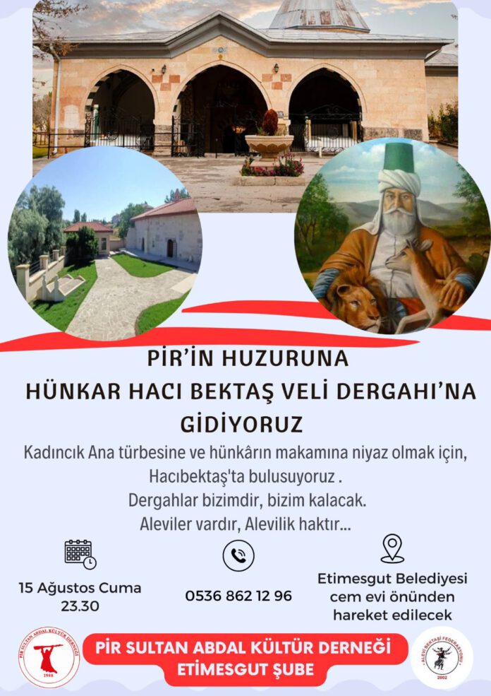 15 Ağustos Cuma gecesi, Pir Sultan Abdal Kültür Derneği (PSAKD) Etimesgut Şubesi, Alevi-Bektaşi inancının önemli sembollerinden biri olan dergahların korunması ve sahiplenilmesi gerektiğini vurguladı. Etkinlikte, dergahların toplumsal ve kültürel önemi üzerinde duruldu.