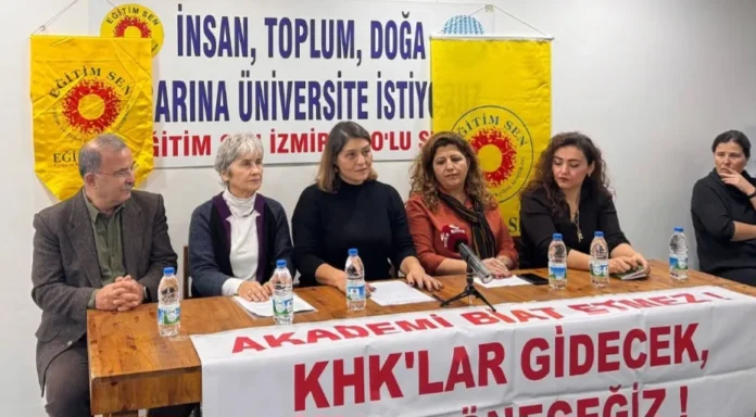 ​Eğitim Sen İzmir Üniversiteler (3 Nolu) Şube binasında gerçekleştirilen basın açıklamasında, ihraç edilen akademisyenlerin yaşadığı hukuki çıkmaz verilerle paylaşıldı. Şube Başkanı Lülüfer Körükmez tarafından okunan metinde, on yıllık sürecin sonunda yalnızca 5 akademisyen hakkında kesinleşmiş iade kararı bulunduğu vurgulandı. Açıklamada, Anayasa Mahkemesi’nin 2019 yılında verdiği “hak ihlali” kararına rağmen, yerel mahkemelerin ve idari mekanizmaların süreci sürüncemede bıraktığı ifade edildi.