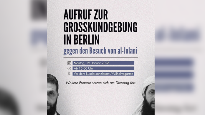 Avrupa’da faaliyet yürüten Kürt, Alevi ve insan hakları kurumları, Suriye geçici hükümeti Cumhurbaşkanı Ahmed El Şara’nın 19 Ocak Pazartesi günü Almanya’nın başkenti Berlin’e yapması planlanan ziyarete karşı protesto eylemi düzenleyecek.