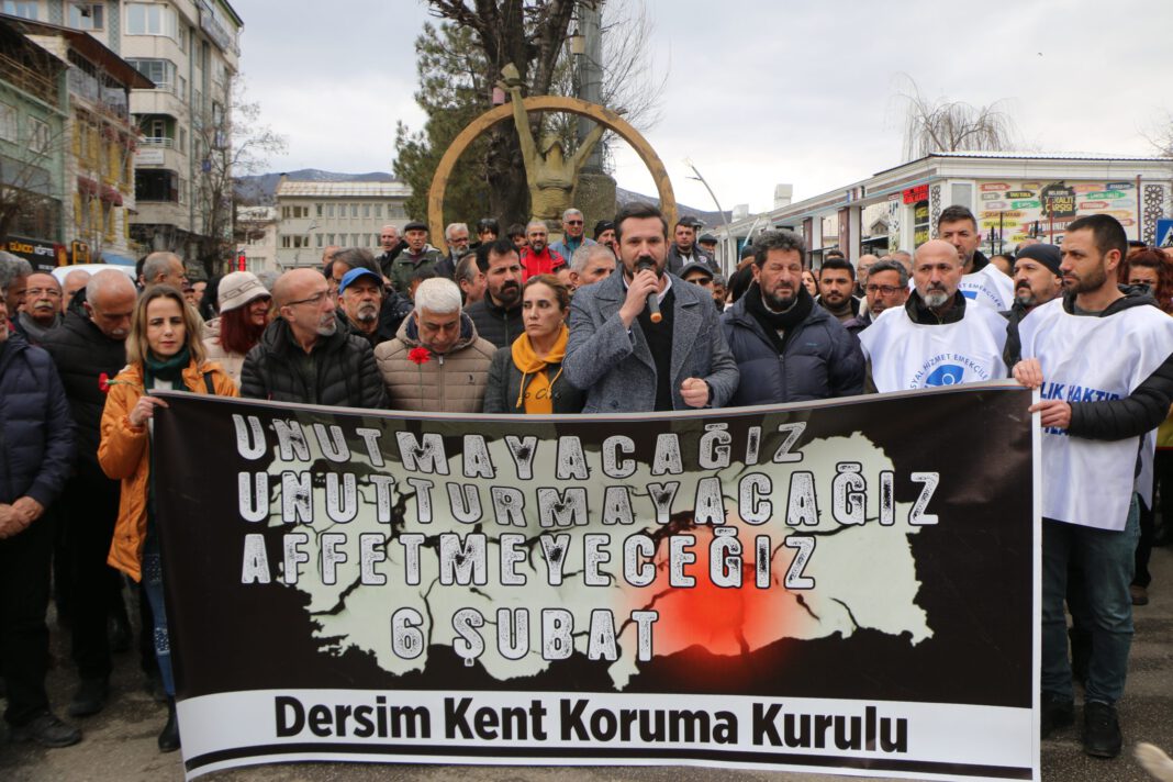 PİRHA- Dersim’de 6 Şubat depremlerinin birinci yıl dönümünde Dersim Kent Koruma Kurulu, İnsan Hakları Anıtı önünde depremde yaşamını yitirenleri andı. Kurul adına konuşan Uğur Beycan, “Aradan geçen bir yıla rağmen deprem bölgesinde hala tek bir çivinin çakılmadığı, molozların dahi kaldırılmadığı yerler var. Milyonlarca insan çadır kente dönüşmüş şehirlerde kaderine terk edilmiş durumda” dedi.