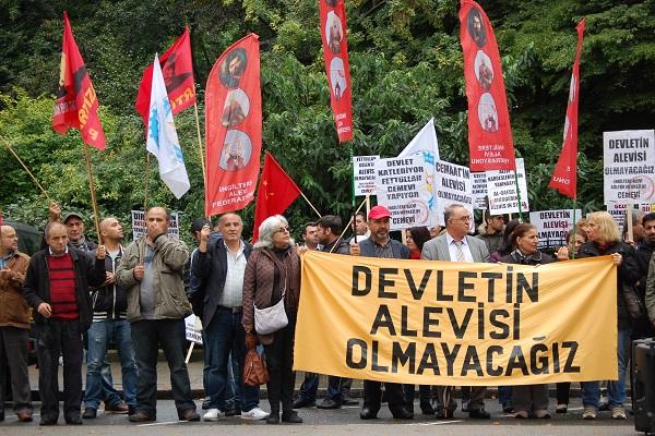 Cumartesi günü saat 12.00 sıralarında Türkiye Cumhuriyeti Londra Büyükelçiliği önünde düzenlenen gösteriye, İAKM ve Cemevi Başkanı İsrafil Erbil, Day-Mer Başkanı Ahmet Sezgin ve Cemevi yöneticilerinin de aralarında bulunduğu çok sayıda Alevi vatandaşı katıldı.